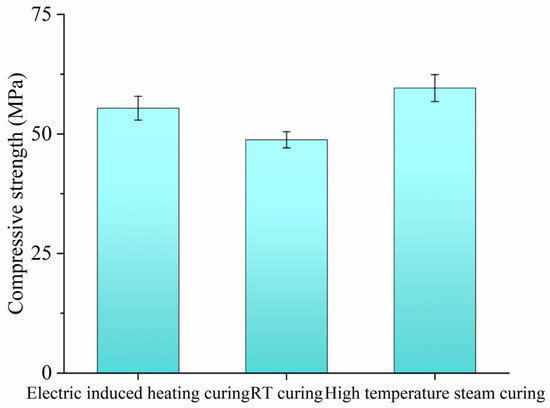Figure 9 depicts the compressive strength of SF-HPC cured by different methods. It can be found that electric-induced heating curing improved the compressive strength of SF-HPC under −20 °C of 55.4 MPa with the curing age of 2 days, which was much higher than that of the specimen cured by 3 days’ RT curing (48.8 MPa), showing an increase of 13.5%, and this was also consistent with the strength of the specimen cured by 2 days’ high-temperature steam curing. The compressive strength highlighted the advantage of electric-induced heating for fabricating high-performance concrete in a severely cold environment.