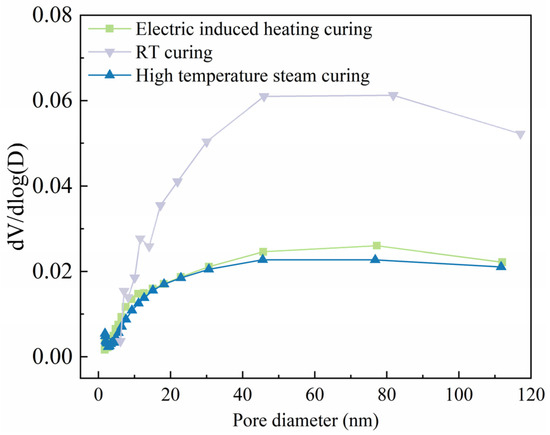 BET analysis was conducted to investigate the pore structure of SF-HPC specimens cured by different methods as exhibited in Figure 10. RT cured specimens depicted the largest pore distribution situation, while the specimens cured by electric-induced heating curing and high-temperature steam curing depicted comparable pore size distributions, indicating the similar pore structure inside the specimens. The BET analysis results reflected the advantage of electric-induced heating curing for refining the pore structure of SF-HPC even in a severely cold environment.