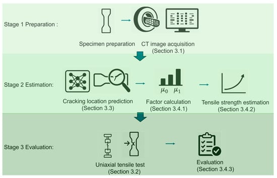 An overview of the complete workflow is provided in Figure 1. The prepared UHPFRC dog-bone specimens are first subjected to X-ray computed tomography (CT) scanning, and the resulting CT images are processed to obtain fiber distribution data. A deep learning-based method is then used to predict the likely cracking location from these images. Based on the predicted location, the corresponding cross-section is analyzed to extract fiber orientation factors (μ0) and fiber efficiency factors (μ1), which are subsequently used to estimate the tensile strength of the specimen. To evaluate the approach, uniaxial tensile tests are performed to obtain the actual cracking location and measured tensile strength. The predicted and experimental results are compared to assess the accuracy of cracking location prediction and the reliability of strength estimation. This integrated approach enables the development of a reliable, non-destructive tensile strength estimation framework for UHPFRC based on predicted cracking locations.