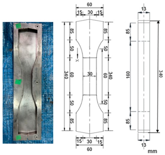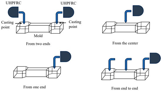 As shown in Figure 2, the fresh UHPFRC, which exhibited a slump flow of 258 mm, was cast into dog-bone-shaped molds with a total length of 340 mm. The gauge section measured 60 mm in length and maintained a constant cross-section of 30 mm × 13 mm, flanked by 50 mm transition zones. To achieve different fiber distribution characteristics, as shown in Figure 3 and Table 3, a total of 26 specimens were cast using four different casting methods. The number of specimens varied across casting methods according to the experimental objectives and the expected variability in fiber distribution. A larger number is assigned to U2E due to higher expected variability, a moderate number is assigned to UC given its near-isotropic fiber distribution, and fewer specimens are assigned to U1E and UEE based on existing knowledge of unidirectional fiber flow behavior and the anticipated minor differences between these casting types. After casting, the specimens were initially covered with plastic sheets to retain moisture and kept warm for 24 h. Subsequently, the molds were removed, and the specimens were subjected to moist curing at 20 °C and 100% relative humidity until testing. Specimens were tested at 81 days of age.