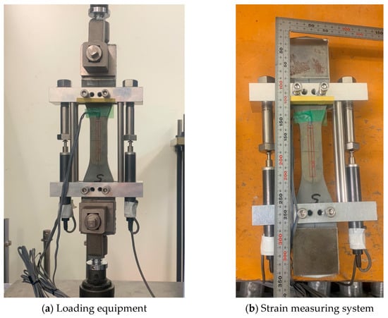 Before the uniaxial tensile test, all specimens were first affixed with 60 × 60 mm cast iron patches at both ends to prevent damage to the specimen ends by the fixture during testing and to avoid relative sliding caused by insufficient connection between the fixture and the contact surface of specimens. The uniaxial tensile test was conducted using a 50 kN electronic servo-hydraulic universal testing machine (Instron, Norwood, MA, USA) with displacement control, as shown in Figure 4a. The displacement rate was set to 0.05 mm/min before the peak stress and 0.5 mm/min after the peak stress. A specialized test frame was used to measure elongation on both sides of the specimen, employing two linear variable differential transformers (LVDTs) with a 150 mm gauge length. The average value of the two LVDTs was used to calculate the tensile strain, as illustrated in Figure 4b.