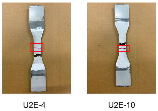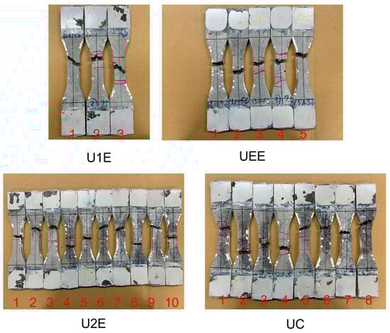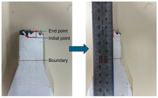 After completing the UTT, the width of the cracking location for each specimen was measured. As illustrated in Figure 5, the procedure comprises the following steps: Initially, the boundary between the gauge length and the transition zone was identified, which serves as the starting point for the measurement. Then, based on this starting point, the crack initial point nearest to the boundary and the crack end point farthest from the boundary were determined. Finally, the perpendicular distance between the initial and end points was measured. This distance is defined as the width of the cracking location. This method ensures high repeatability and accuracy in the measurement of the width of the cracking location.