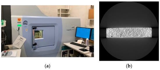 Figure 6. CT scan process. (a) Shimadzu inspeXio SMX-225CT FPD HR Plus scanner. (b) CT image of transversal section.
