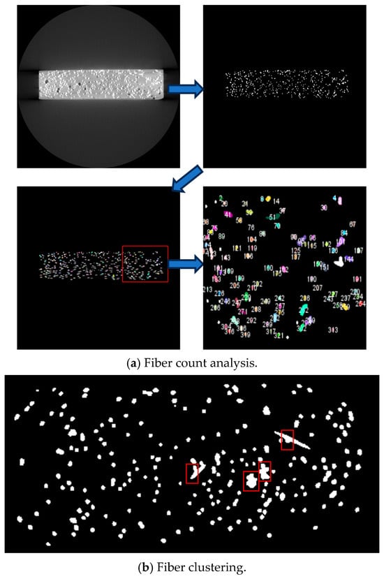 • Modification of CT image analysis results: As illustrated in Figure 7b, fiber clustering occasionally occurs during the casting process, as highlighted within the red boxes in the binarized CT image. This phenomenon introduces errors when analyzing fiber counts using image analysis techniques. To mitigate the impact of these errors on the results, manual visual inspection was employed to adjust the fiber count results obtained through image analysis software.