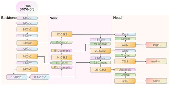 The deep learning model employed in this study is YOLOv11 (You Only Look Once, version 11), developed by Ultralytics [37,38]. YOLOv11 represents the latest advancement in the YOLO series for object detection, renowned for its efficiency and accuracy in real-time applications. This iteration improves upon its predecessors by enhancing object detection capabilities, offering superior performance and speed. YOLOv11 excels at identifying and classifying multiple objects within images through a single neural network pass, making it highly suitable for tasks requiring rapid and precise object detection. Its architecture incorporates Convolutional Layers (Conv), CSP Bottleneck with 2 convolutions (C3k2), Spatial Pyramid Pooling-Fast (SPPF), and CSP-PAN Spatial Attention (C2PSA), optimizing both detection speed and accuracy, and setting new benchmarks in computer vision. Figure 8 illustrates the YOLOv11 framework.