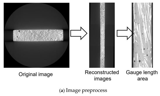 Before using deep learning, CT images need to be preprocessed first. As shown in Figure 9a, the CT images of all specimens were reconstructed using Fiji to obtain longitudinal images. These images were then cropped to match the actual proportion of the specimen’s gauge length, and the excess black background was removed, retaining only the regions containing fiber information. Each specimen produced 270 images for use in the second step, each with a resolution of 467 × 185 pixels.