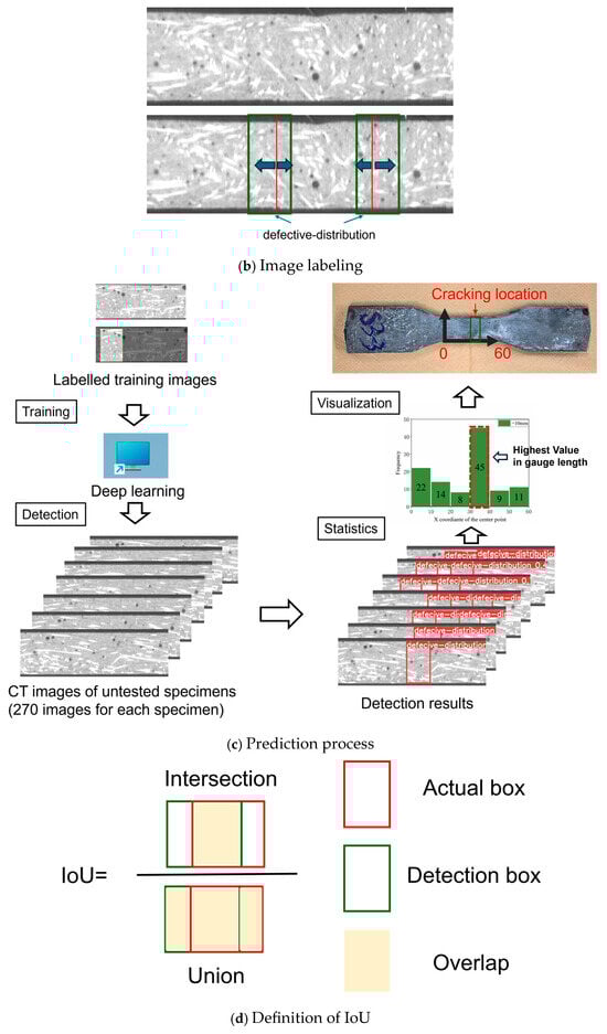 In order to evaluate the results of cracking location prediction, refer to the definition of mean Average Precision (mAP) [40]. As shown in Figure 9d, the mAP@50 uses the 50% Intersection over Union (IoU) threshold to determine whether the detection box and the actual box match correctly. In this study, a prediction is deemed successful when the overlap rate between the detection box and the actual box reaches or exceeds 50%. It should be noted that the IoU will not be calculated if the crack in a specimen occurred entirely outside the gauge length. Conversely, if any portion of the crack extends beyond the gauge length, only the area within the gauge length will be considered for the actual box when calculating the IoU.