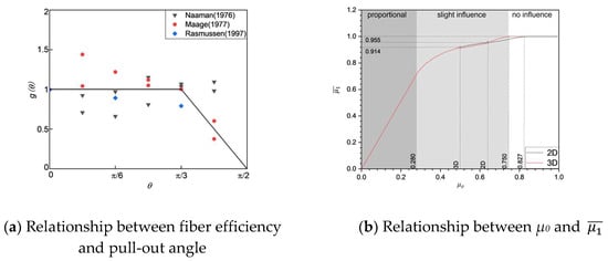 Figure 10. Fiber characteristics factors [41,42,43,44,45]. (a) Relationship between fiber efficiency and pull-out angle; (b) relationship between μ0 and μ 1 ¯ .
