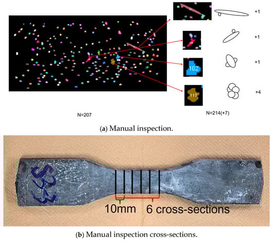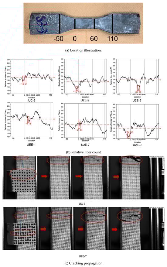 As shown in Figure 11a, the cross-section at the 50th mm mark of specimen U1E-1 initially yielded a fiber count of N = 207 through image analysis software. However, upon manual visual inspection, it was evident that some clustered fibers had been mistakenly identified as individual ones. The fiber count was subsequently adjusted to N = 214 (+7).