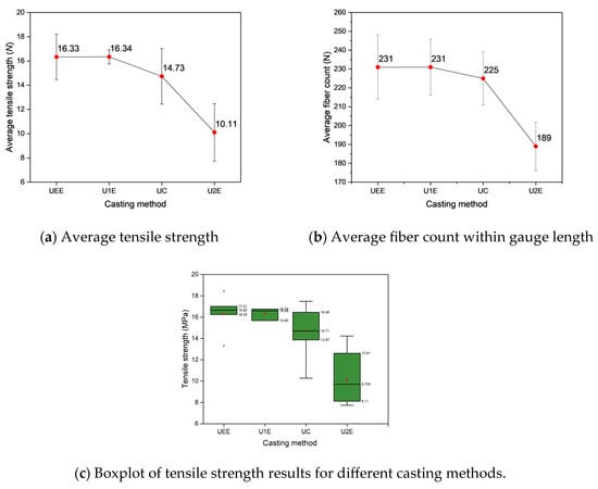 • The casting method significantly influences fiber distribution and tensile performance. Casting techniques promoting uniform fiber flow, such as casting from center or end-to-end, result in improved fiber orientation and higher tensile strength, while casting from two ends leads to fiber misalignment and lower predictability.