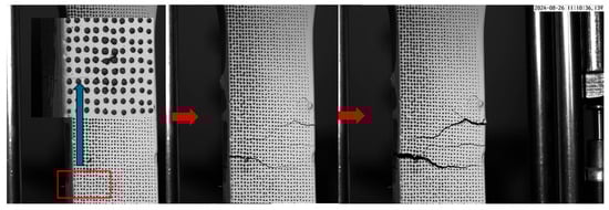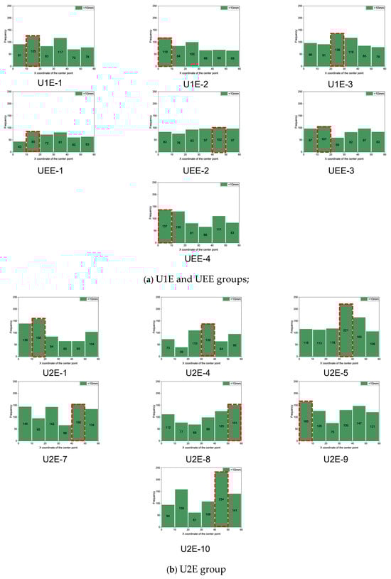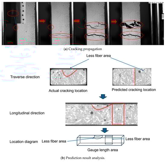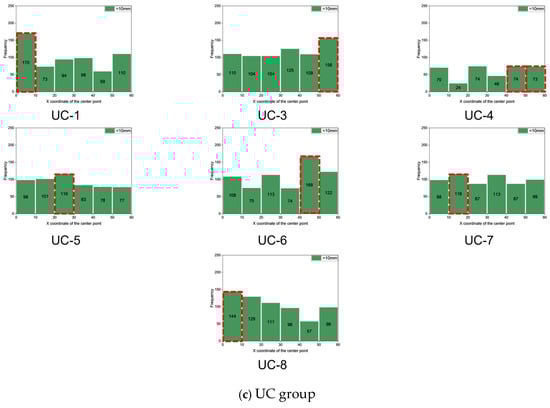 As shown in Figure 9c, the labeled images were first divided into training, validation, and test sets in a ratio of 7:2:1 for deep learning training. Then, the trained deep learning model was subsequently applied to detect “defective-distribution” on 270 images from each specimen outside the dataset, generating results with label information (the height, width, and the center point coordinates of the detection boxes.). After that, the detection results were statistically analyzed to produce a frequency distribution histogram of the X-coordinate of the center points of the detection boxes. Finally, the highest value in the histogram was selected as the predicted cracking location and visualized on the specimen. It should be noted that the coordinate system uses the gauge length as the origin of the abscissa.