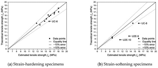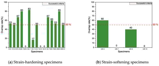 In contrast, as shown in Figure 24b and Figure 25b, strain-softening specimens exhibited considerably larger deviations between predicted and actual cracking locations, which lead to substantially higher error values. Unlike strain-hardening specimens, which tend to develop multiple cracks and undergo progressive damage, strain-softening specimens are characterized by a single dominant crack. Consequently, their failure mechanisms are highly sensitive to local fiber depletion zones. This leads to greater unpredictability in crack formation and increased dispersion of errors. For example, U2E-9 and U2E-10, which did not yield accurate cracking location predictions, exhibited extremely high errors. Specimen U2E-9, which had an actual cracking location of (−12)–(−2) instead of the predicted cracking location (0–10), had an experiment-estimation error of −58.81% and a theory-estimation error of −38.17%—one of the highest values recorded in this study. Similarly, U2E-10 exhibited an experiment-estimation error of −54.41% and a theory-estimation error of −30.50%, further highlighting the challenges of predicting cracking locations in strain-softening specimens. These large discrepancies indicate that predictive models, which often assume a relatively uniform fiber orientation, are unable to accurately capture the actual failure behavior of strain-softening specimens.