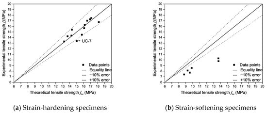 The actual cracking locations, predicted cracking locations, estimated tensile strength (fte), and theoretical tensile strength (fta) were summarized alongside the experimental tensile strength (ft). The errors between the estimated tensile strength (fte), theoretical tensile strength (fta), and experimental tensile strength (ft) were analyzed by examining experiment-estimation error (Eexp) and theory-estimation error (Etheo) in Table 10. Etheo was introduced to minimize the influence mentioned in Section 3.3.2 that could affect the results. Specifically, fta, calculated at the actual cracking location, serves as a benchmark to better evaluate the accuracy of fte, estimated at the predicted cracking locations.