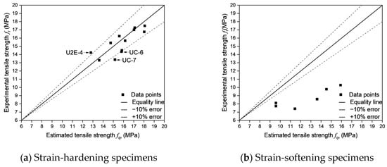 As shown in Table 10, the accuracy of cracking location predictions plays a crucial role in determining the reliability of tensile strength estimation in UHPFRC. Moreover, an analysis of the fracture behavior of specimens reveals distinct trends in both error magnitudes and the effectiveness of cracking location predictions. In particular, strain-hardening specimens exhibit higher estimation accuracy and lower errors, with an average experiment-estimation error of 5.72% and an average theory-estimation error of 3.34%. While strain-softening specimens display greater deviations between predicted and actual crack locations, resulting in significantly higher errors (an average experiment-estimation error of 43.09% and an average theory-estimation error of 15.73%). These findings further indicate that successful cracking location predictions correspond to lower experiment-estimation errors and theory-estimation errors, while failed predictions lead to increased deviations—especially in strain-softening specimens.