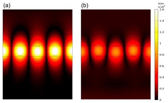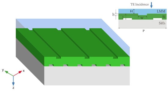 Figure 1 shows a schematic of the proposed structure. Silicon (n = 3.4) was selected as the waveguide layer material, with a thickness of l = 181 nm, while silicon dioxide (n = 1.46) served as the semi-infinite substrate. The substrate thickness has a negligible effect on the optical spectra when it exceeds 500 nm, as the local field resonance primarily occurs within the silicon waveguide. Therefore, a semi-infinite substrate was used instead of a finite-thickness “thick” substrate, so as to simplify the simulations. Periodic rectangular grooves were etched into the silicon surface, with a grating period of P = 1192 nm, groove width w = 80 nm, and groove depth h = 10 nm. The lower surface grooves were filled with air, while the upper surface was coated with an LMM layer of thickness H = 200 nm. This study focuses on transverse electric polarization, where the electric field oscillates along the y-direction.