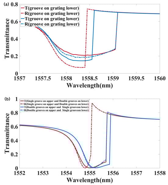 Table 1 presents the performance under four different structures. Notably, the highest transmission contrast was achieved for the double-sided grating structure with a single groove on the upper surface and a double groove on the lower surface.