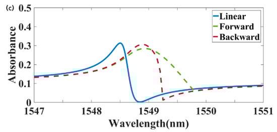 Figure 4a,b illustrate the forward and backward electric field intensity distributions at a wavelength of 1549.2 nm under an incident light intensity of 18 kw/cm