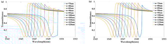 Figure 5b shows the transmission of backward incidence. Decreasing w from 120 to 75 nm shifted the transmission peak from 1546.1 to 1549.8 nm, resulting in a redshift of approximately 3.7 nm. As w decreased from 80 to 75 nm, the peak reverse transmission decreased significantly. As shown in