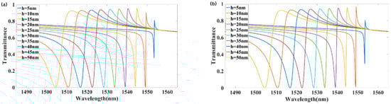 Figure 6a shows the forward-incident transmission spectra for different values of h. Decreasing the groove depth h from 50 to 5 nm shifted the transmission peak from 1512.4 to 1553.6 nm, resulting in a redshift of approximately 41.2 nm. At h = 15 nm, the transmission peak reached its maximum value. As h decreased, the transmission peak also decreased.