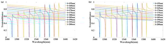 Figure 7a,b illustrate the forward and reverse transmittances for various values of l. As l increased, the maximum transmissivity of the metasurface resonance increased correspondingly. As l increased from 155 to 200 nm, the peak forward transmittance increased from 0.648 to 0.976, while the peak backward transmittance increased from 0.726 to 0.948. At l = 175 nm, the reverse transmittance first exceeded 0.9, and after fine-tuning l, it reached 0.964 at l = 181 nm.