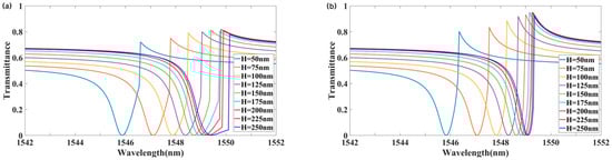 Figure 8 illustrates the transmission for different values of H, showing a redshift in the resonance wavelength as H increases. Comparing