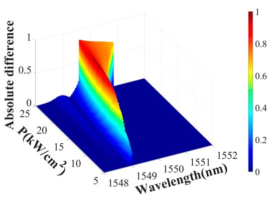 Figure 9 shows the absolute difference between the forward and backward transmittance of the metasurface under different incident light intensities. As the incident power increases, the dielectric constant distribution of the LMM shows greater differences in different cases of forward and backward incidence, increasing the working bandwidth of nonreciprocal transmission. The average dielectric constant of the LMM increases with the increase in power, reducing the maximum value of the absolute difference. Notably, optical isolation in the proposed system is achieved at a power density of 7 kW/cm