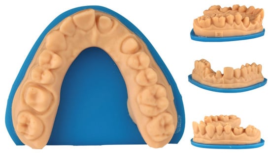 - Jin, S.J.; Jeong, I.D.; Kim, J.H.; Kim, W.C. Accuracy (trueness and precision) of dental models fabricated using additive manufacturing methods. Int. J. Comput. Dent. 2018, 21, 107–113. [Google Scholar]