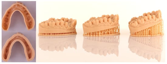 The different 3D printing technologies, as well as the type of resin, the geometry of the design, the printing orientation, the thickness of the layer, the number and position of support structures of the printed cast, and, where applicable, post-processing after printing are factors that seem to influence the accuracy of dental physical casts [18,19,20]. Accuracy of a 3D printer is defined as the combination of two parameters: trueness and precision, according to the International Organization for Standardization (ISO) [21]. Trueness refers to the degree of deviation between the printed object and the original reference model, while precision indicates the degree of variation among multiple printed objects produced under identical conditions [22,23]. In dental applications, achieving both high trueness and high precision is essential to ensure proper fit, functionality, and long-term success of prosthetic restorations. Print orientation is a key factor affecting both the dimensional accuracy and surface characteristics of 3D-printed dental casts; recent studies [20,24,25,26,27,28] show it can significantly influence properties like surface wettability and mechanical performance. Shell thickness is equally important, as thicker shells generally improve structural rigidity and resistance to deformation but may increase material usage without always enhancing accuracy. In contrast, thinner shells are more cost-effective but can be prone to distortion or warping during post-processing. Therefore, optimal shell thickness should achieve a balance between mechanical stability and dimensional accuracy [25,29,30,31,32].