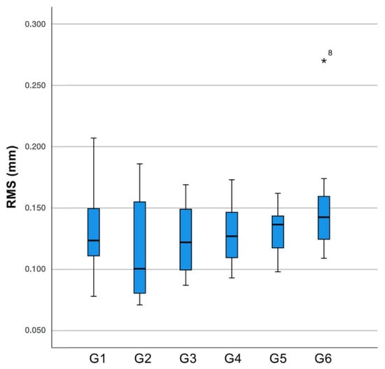 Box plot of overall root mean square (RMS) error discrepancies (mm) for the tested groups. The asterisk (*) denotes an outlier in Group 6 (G6).