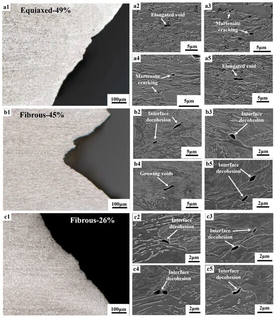 - The DP microstructures of Equiaxed-49%, Fibrous-45%, and Fibrous-26% involve a tensile strength above 1 GPa, but the damage mechanism is different. The major damage mechanism is martensite cracking in Equiaxed-49%, while that is interface decohesion in the fibrous microstructures.