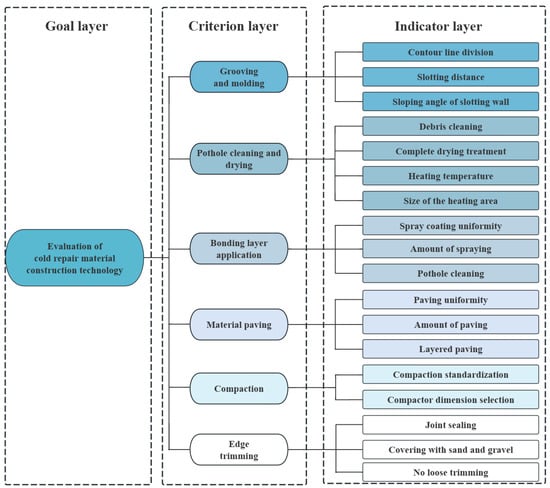 The evaluation model is structured into three hierarchical layers: the goal layer, representing the overall objective of optimizing cold mix asphalt pothole repair processes; the criterion layer, encompassing the key evaluation criteria; and the indicator layer, comprising specific technical parameters that influence repair quality and efficiency.