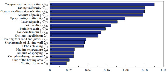 As illustrated in Figure 2, the indicators with the highest comprehensive weights are compaction standardization, compactor dimension selection, material paving quantity, and paving uniformity. These findings underscore the critical importance of standardized paving and compaction in cold mix asphalt (CMA) pothole repair. The quality of these processes directly influences the overall effectiveness and durability of the repair. Given their significant impact, it is recommended that construction personnel prioritize paving and compaction operations on-site. Specifically, attention should be paid to achieving appropriate paving quantity, ensuring uniform material distribution, and achieving thorough compaction to enhance repair performance and longevity.