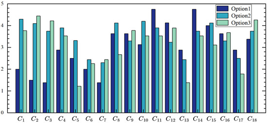 From Table 8, we can obtain the weights of 18 specific process indicators relative to the overall objective. By applying Equation (5) to rank the hierarchy consistency, the calculated result is CI = 0.0174, which means CR = 0.0108 < 0.1. The comprehensive weights pass the consistency test.