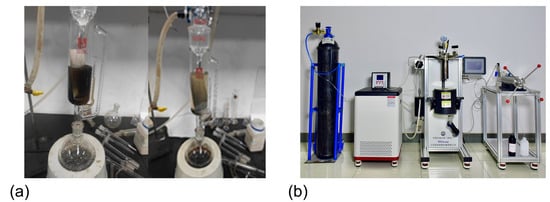 To investigate the impact of polymers on sand sedimentation characteristics, Soxhlet extraction and supercritical water oxidation technologies were used to treat the sedimented sand. By combining a laser particle size analysis system, the polymer-containing sand particle size distribution and true sand particle size distribution in shale oil production fluids were analyzed. This helped reveal the mechanism of sand aggregation in regard to these fluids. The Soxhlet extraction experimental system, as shown in Figure 2a, consists of a condenser, an extraction tube, a siphon tube, and an extraction flask. Petroleum ether is used for cyclic extraction to remove the oil phase and some polymers, preserving the original aggregation morphology of the sand particles. The supercritical water oxidation experimental system, shown in Figure 2b, consists of a reactor, a condenser, a manual metering pump, and gas cylinders. Under excess oxidant and time conditions, the polymers are thoroughly degraded at 400 °C and 25 MPa to obtain the residue-free true sand particle size. The morphological characteristics of the sand samples treated using both methods are shown in Figure 3. Particle size testing was conducted using a Malvern Mastersizer 3000 laser particle size analyzer (Malvern Panalytical, Shanghai, China), based on the Mie scattering principle (detection range: 0.01–3500 μm). Wet ultrasonic dispersion was employed to ensure the accuracy of the data.