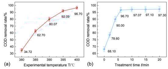 COD removal rate for different SCWO treatment conditions: (a) 25 MPa, 6 min; and (b) 25 MPa, 400 °C.