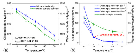 Physical properties of shale oil and produced water: (a) the density–temperature relationship; and (b) the viscosity–temperature relationship.