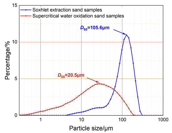 Soxhlet extraction and supercritical water oxidation methods were successively used to treat the sedimented sand. In regard to the Soxhlet extraction method, approximately 250 g of petroleum ether and the sedimented sand sample were placed into a 500 mL flask, with the flask connected to a Soxhlet extractor. The petroleum ether was used for cyclic extraction to remove the oil phase and some polymers. After the surface petroleum ether had evaporated, the sample was placed in an oven at 65 °C for 30 min to dry the sample, and was then weighed, thus obtaining the Soxhlet-extracted sand sample containing polymers. The treated sand sample was dried at 120 °C for 15 min, and its particle size distribution was measured using a Malvern Mastersizer 3000 laser particle size analyzer.