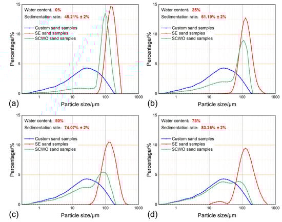 At a temperature of 30 °C, a sand concentration of 0.4 g/L, and sedimentation time of 30 min, the sand sedimentation characteristics for different water content are shown in Figure 7. The experiment shows that as the water content increases, the sand sedimentation rate significantly improves, with the increase in the proportion of small particle-sized sand sedimentation being particularly noticeable. At the same time, as the water content increases, the proportion of agglomerates with a particle size greater than 300 μm in the Soxhlet-extracted sand gradually increases, exceeding the particle size of the prepared sand sample. After the supercritical water oxidation treatment decomposes the polymers in the sedimented sand, large aggregates bonded by polymers break down into fine sand particles, with a size range of 1–50 μm. As the water content increases, the particle size distribution curve of the SCWO-treated sand increasingly aligns with the particle size distribution curve of the prepared sand.