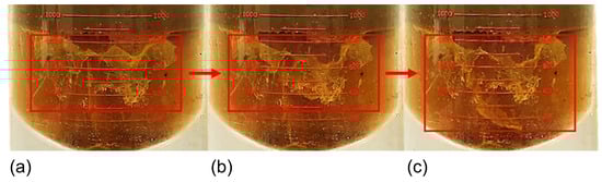 Analyzing the evolution of sand sedimentation characteristics, at 0% water content, the sedimentation mechanism mainly involves the single-particle sedimentation of large sand particles. This results in a concentrated particle size distribution, as shown in Figure 7a. When the water content increases to 25%, the sand sedimentation rate increases by about 16%. This is because as the water content increases, more sand particles enter the low-viscosity water phase during the emulsion preparation shear process, significantly reducing the viscous resistance to sedimentation, especially for smaller sand particles with poor sedimentation ability. In Figure 7b, this is reflected by the particle size distribution of the Soxhlet-extracted sand moving towards smaller particle sizes. At the same time, polymer precipitation occurs during the static sedimentation process, as shown in Figure 8. Flocculent polymers adhering to sand particles induce a flocculation–sedimentation effect, promoting the aggregation of small-sized sand particles into larger aggregates and settling synergistically, leading to a significant increase in the proportion of small particle-sized sand in the SCWO-treated sand. When the water content increases to 50% and 75%, the water phase in regard to the emulsion gradually becomes the continuous phase, and the viscous effect of the polymer starts to appear, slowing down the sedimentation rate of the sand. As a result, the sedimentation rate increases by 12.88% and 9.19%, with the increase showing a gradual deceleration trend. Additionally, the large amount of polymers dissolved in the sample with a high water content further enhances the flocculation–sedimentation effect, causing the sand particles to aggregate into clusters, with a particle size greater than 500 μm.