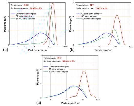 With a water content of 50%, a sand concentration of 0.4 g/L, and a sedimentation time of 30 min, the sand sedimentation characteristics at different temperatures are shown in Figure 9. The experimental results show that as the temperature increases, the sand sedimentation rate significantly improves. The particle size distribution curve of the SCWO-treated sand increasingly aligns with the particle size distribution curve of the prepared sand, while the particle size distribution range of the Soxhlet extraction-treated sand continues to expand and exhibits a bimodal feature in high-temperature conditions.