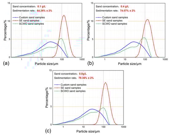 At a temperature of 30 °C temperature, a water content of 50%, and a sedimentation time of 30 min, the sand sedimentation characteristics at different sand concentrations are shown in Figure 10. The experiment shows that as the sand concentration increases, the sand sedimentation rate slightly improves. Additionally, the particle size distribution curves of the Soxhlet extraction-treated sand and SCWO-treated sand do not show a significant correlation with changes in the sand concentration. Under 50% water content conditions, when the sand concentration increases by eight times, the sand sedimentation rate increases by only 15.09%, and there is no significant change in the sedimented sand particle size distribution. This indicates that the sand concentration in the emulsion has only a secondary impact on the sand sedimentation characteristics.