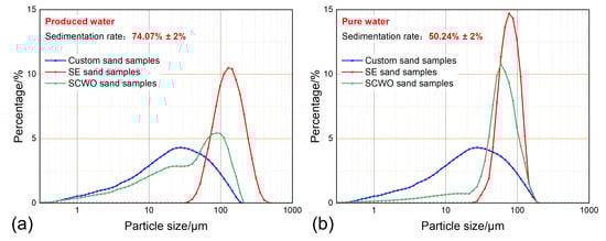 Comparing Figure 11a,b, it can be seen that under pure water conditions, the particle size distribution curves of the Soxhlet extraction-treated sand and SCWO-treated sand both show a concentrated unimodal form, indicating that the sedimentation mechanism mainly involves single-particle sedimentation of large particle-sized sand. This is because under pure water conditions, the polymer concentration in the emulsion is very low, and there is no flocculation effect to increase the sand particle size. Therefore, no sand particles larger than 300 μm are present in the Soxhlet extraction-treated sand particle size distribution curve. Moreover, under pure water conditions, the minimum particle size of the Soxhlet extraction-treated sand is slightly smaller than that in produced water, indicating that the water-washing effect in pure water conditions allows smaller particle-sized sand to sediment. This is because the lack of polymer hindrance in the pure water environment results in a more effective water-washing effect. However, in regard to the particle size distribution curve of the SCWO-treated sand, the proportion of small particle-sized sand in pure water conditions is much smaller than that in produced water. This indicates that the polymer flocculation–sedimentation effect plays a more significant role in promoting the sedimentation of small particle-sized sand, and it is this effect that leads to a further improvement in the sedimentation rate.