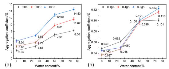 By using the aggregation coefficient to represent the particle size differences between the two treatment methods, the influence of the water-washing effect can be effectively removed, and the polymer flocculation–sedimentation effect can be quantified. The characteristics of the aggregation coefficient at different temperatures, sand concentrations, and water content conditions are shown in Figure 12.