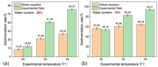 For the conditions with a water content of 25% and 75%, assuming that the emulsion containing sand is uniformly distributed, the critical particle diameters that can settle 30 cm within 30 min, are calculated using the Stokes model, based on the properties of oil and water. The ideal sedimentation rates are then calculated according to the original sand particle size distribution, and the model results are compared with the experimental results, as shown in Figure 13. The analysis shows that at 20 °C, there is no significant flocculation–sedimentation phenomenon, and the deviation between the Stokes model-calculated sedimentation rate and the experimental value is within ±5%. As the temperature increases, the density and viscosity of the oil–water phase decrease, reducing the viscous resistance against sedimentation and increasing the settling velocity. The Stokes model calculations for the sedimentation rates increase under all the water content conditions. At the same time, higher temperatures reduce the stability of the polymer, promoting flocculation–sedimentation, which results in a substantial increase in the experimental sedimentation rates for all the water contents. Under the 30 °C condition, the average experimental data exceeds the Stokes model calculation by 25.87%, while at 40 °C, it exceeds the calculation by 36.51%. The flocculation–sedimentation effect shows a linear growth trend with rising temperatures. Furthermore, at 40 °C and 25% water content, flocculation–sedimentation leads to a 43.25% increase in the sedimentation rate, while under the 75% water content condition, the increase is only 29.77%. This also demonstrates that the flocculation–sedimentation phenomenon becomes saturated as the water content increases.