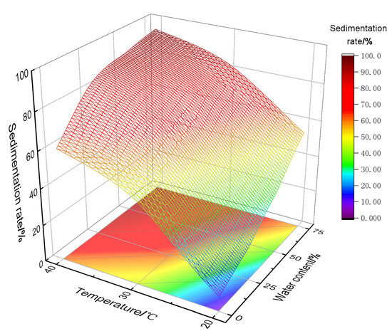 The analysis of the experimental results shows that the temperature and water content regulate sand sedimentation behavior by altering the rheology, polymer stability, and content of polymer-containing shale oil production fluids. As shown in Figure 14, the correlation between the sand sedimentation rate, temperature, and water content is analyzed using the response surface methodology. It is found that the sand sedimentation rate is positively correlated with both the temperature and water content, with temperature being the dominant factor. The water content indirectly influences the sand sedimentation characteristics by regulating the water-washing effect and flocculation–sedimentation effect. Under low-temperature conditions, the high viscosity of shale oil results in greater viscous resistance to sand particle sedimentation. The sedimentation mechanism is dominated by single-particle gravity sedimentation, and even in high water content conditions, the sand sedimentation rate is only 50%. Increasing the temperature significantly reduces the viscosity of shale oil, promoting sand particle sedimentation. However, when the temperature exceeds 30 °C, the reduction in shale oil viscosity slows down, which causes a sharp decline in polymer stability, accelerating polymer precipitation. This strengthens the flocculation–sedimentation effect, gradually shifting the sedimentation mechanism towards multi-particle flocculation–sedimentation.