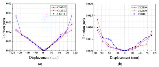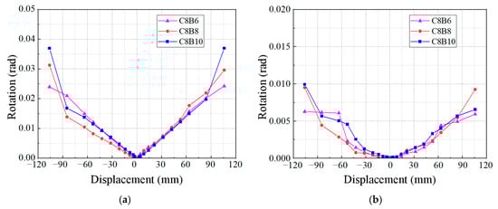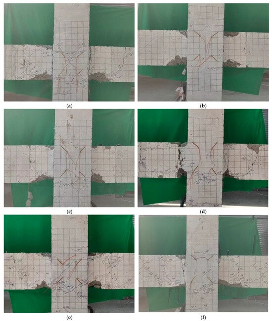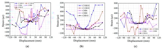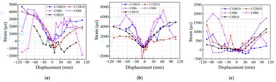 - All specimens showed beam end bending failure, in line with the design principle of ‘strong column and weak beam’. The longitudinal reinforcement of the column section did not reach yield strain, and the stirrup strain in the core area was low (<800 µε), indicating no significant shear failure occurred in the core area of the joint. Additionally, the combination of SFCBs and seawater sand concrete exhibits excellent bonding properties and crack resistance in a corrosive environment, with no sliding failure of the FRP bars.