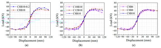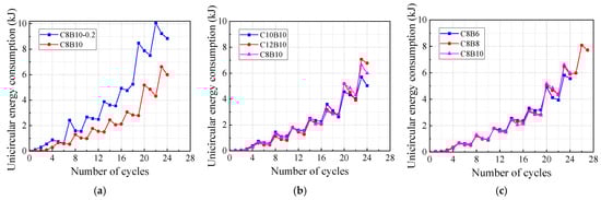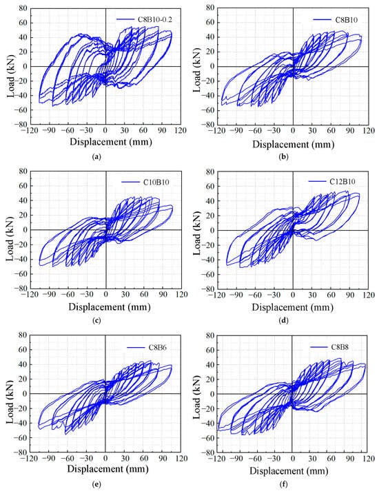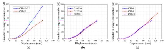 - Increasing the axial compression ratio (e.g., from 0.1 to 0.2) significantly enhances the shear and bond strength of the joints, effectively inhibiting crack propagation and slip, but also accelerating bearing capacity degradation. At the same displacement angle, the energy consumption of the specimen with an axial compression ratio of 0.2 (e.g., C8B10-0.2) is 52% higher than that of the specimen with 0.1, and the cumulative energy consumption is 80% higher.