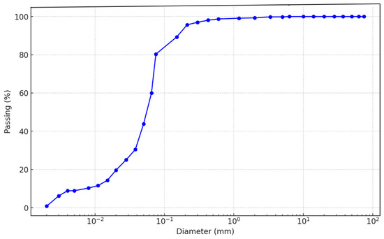 The soil used in this study was obtained from a depth of 2–3 m at a construction site in Dantsinke, Kano State, Nigeria, known for the prevalence of expansive soils. The soil was classified as high-plasticity clay (CH) according to the Unified Soil Classification System (USCS), with a liquid limit of 68% and a plasticity index of 49%. The particle size distribution (PSD) curve in Figure 1 was determined through a combination of sieve analysis for the coarse fraction (gravel and sand) and hydrometer analysis for the fine-grained fraction (silt and clay). These methods are standard for soils with a high fines content. The testing protocol followed ASTM guidelines rigorously, including oven-drying, the disaggregation of soil clumps, and dispersion using sodium hexametaphosphate to ensure accuracy. Table 1 summarizes the material properties of soil, zeolite, and cement. These properties suggest zeolite and cement could synergistically enhance the soil’s mechanical and chemical stability. The specific gravity of soil solids was determined to be 2.7 following ASTM D854-14 [21]. The cement used was ordinary Portland cement obtained from Dangote Cement PLC (Kogi, Nigeria). At the same time, the zeolite was a natural clinoptilolite zeolite obtained from a mining operation and ground to a fine powder passing a No. 200 sieve.