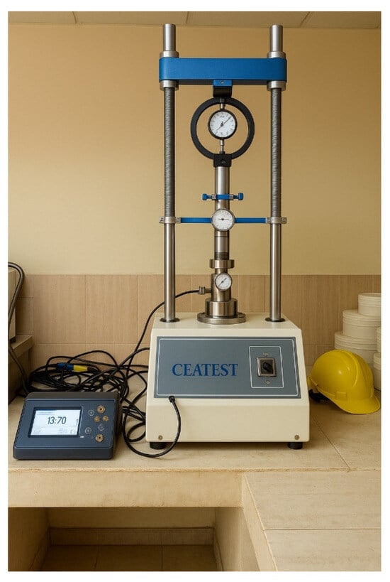 The shrinkage characteristics were evaluated following ASTM D4943-18 [32]. Compacted soil specimens were carefully trimmed to form smooth bars and coated with a thin layer of microcrystalline wax. The coated specimens were then immersed in a bath of molten wax and allowed to cool, forming a wax mold that preserved the initial volume of the specimen. The specimens were then oven-dried at 105 °C until constant mass was achieved. The shrinkage percentage was calculated as the percentage decrease in the specimens’ volume from the initial to the oven-dried state. The shrinkage coefficient, which quantifies the volume change per unit change in moisture content, was also determined using the data obtained from this test. The CBR tests were performed following ASTM D1883-21 [33]. Compacted specimens with a diameter of 152.4 mm and a height of 127 mm were prepared and subjected to either unsoaked or soaked conditions. For the unsoaked CBR, the specimens were tested immediately after compaction. For the soaked CBR, the specimens were subjected to a 96 h soaking period before testing. The CBR values were determined by measuring the resistance to penetration of a standard piston at specified deformation levels and comparing the results to the resistance of a well-graded crushed stone base material. Figure 2 shows the CBR machine.