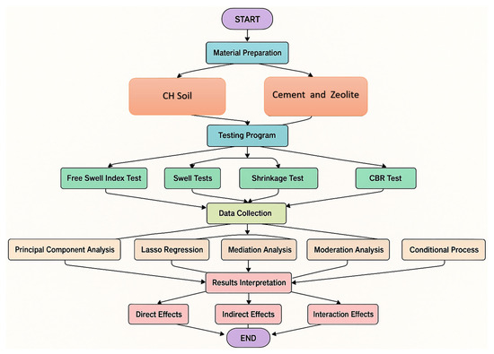 - Principal component analysis revealed that three principal components account for 95% of the total variance in soil properties. Mediation analysis established that zeolite content significantly affects the free swell index (path coefficient = −0.91429, p < 0.0001), with the free swell index significantly influencing the soaked CBR values (path coefficient = −2.13016, p < 0.0001). The total effect of zeolite content on the soaked CBR (coefficient = 1.894114, p = 0.000492) is statistically significant, while the direct effect (coefficient = −0.11108, p = 0.810543) is not, confirming that the relationship is fully mediated by the free swell index, with an indirect effect of 2.005192 (95% CI [1.144505, 3.052653]);